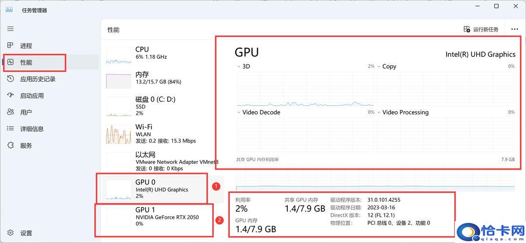 右键点击任务栏选择“任务管理器”,切换到“性能”标签页,选择左侧的“GPU”选项,在右侧面板中,显存信息会标注为“专用GPU内存”,并显示实时使用情况。