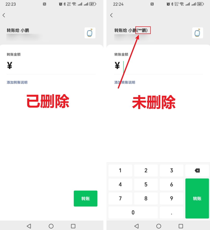 有些朋友就会想知道怎么判断是否被对方删除,其实最简单的方法,就是通过“转账”去验证。我们打开和好友的聊天界面,然后找到【转账】功能,进入转账后,在左上角会出现好友的名称(真名),如果没有出现真名证明已经不是好友关系,我们再点击转账就会显示“已经不是好友”,如下图所示:
