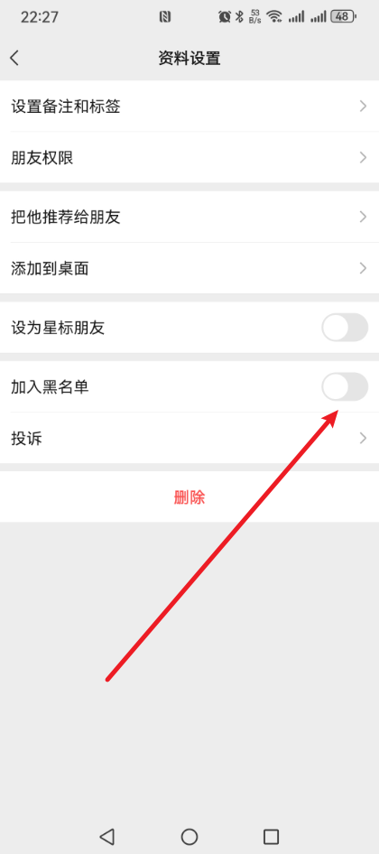 第三步:最后就会看到有一个【加入黑名单】的选项,点击它就可以了,如下图所示: