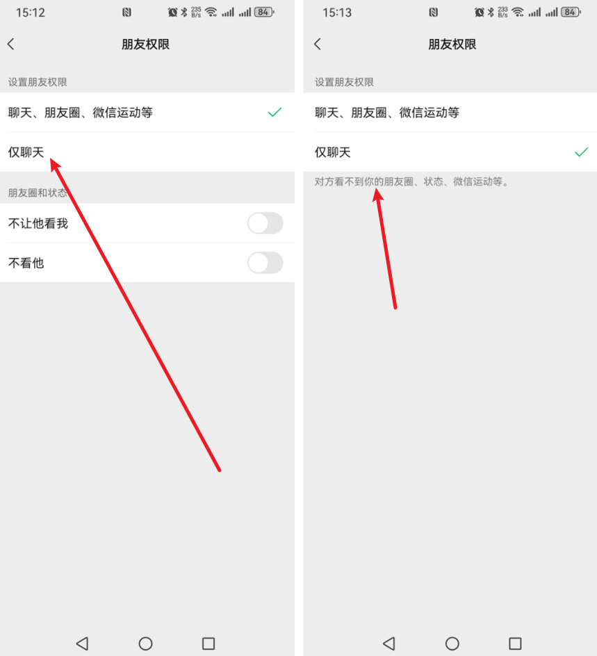 第四步:最后在“朋友权限”中就会看到“设置朋友权限”和“朋友圈和状态”的设置选项,这里我们找到并选择【仅聊天】就可以了,选择之后就会在下方看到有一个提示:“对方看不到你的朋友圈、状态、微信运动等”,如下图所示: