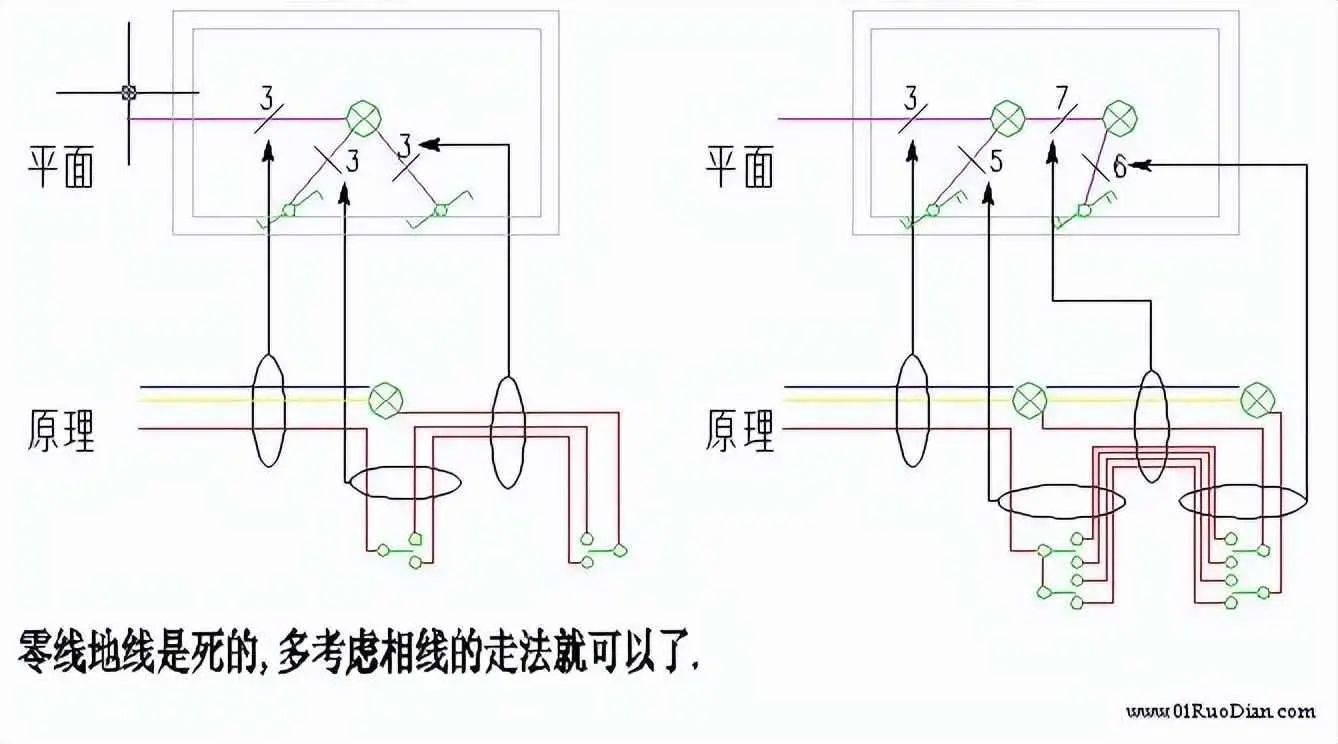 2.灯到开关。一根N进线,出线看开关时几联的,几联(单控情况下)就加几,如灯到二联开关,那么灯与开关间就是三根线。也就是一个进线,两个出线共三根。