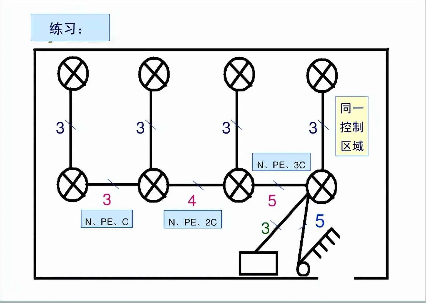 我也是刚学电气设计的,我师傅教我的时候,在纸上画了一个单极开关一个灯一个配电箱,配电箱出来肯定是三根线:火线、零线、PE线,开关控制一盏灯的,所以出来一根控制线,“火线进开关,零线进灯具”,PE线是接外壳的,所以从开关到灯是两根线,从灯到配电箱是三根线(一般不用标)。我觉得这样讲满容易明白的。