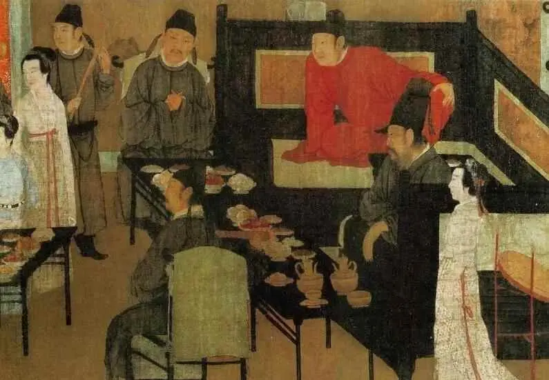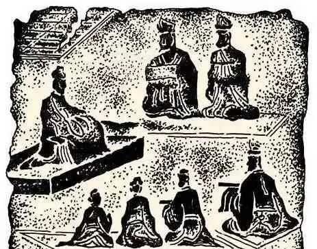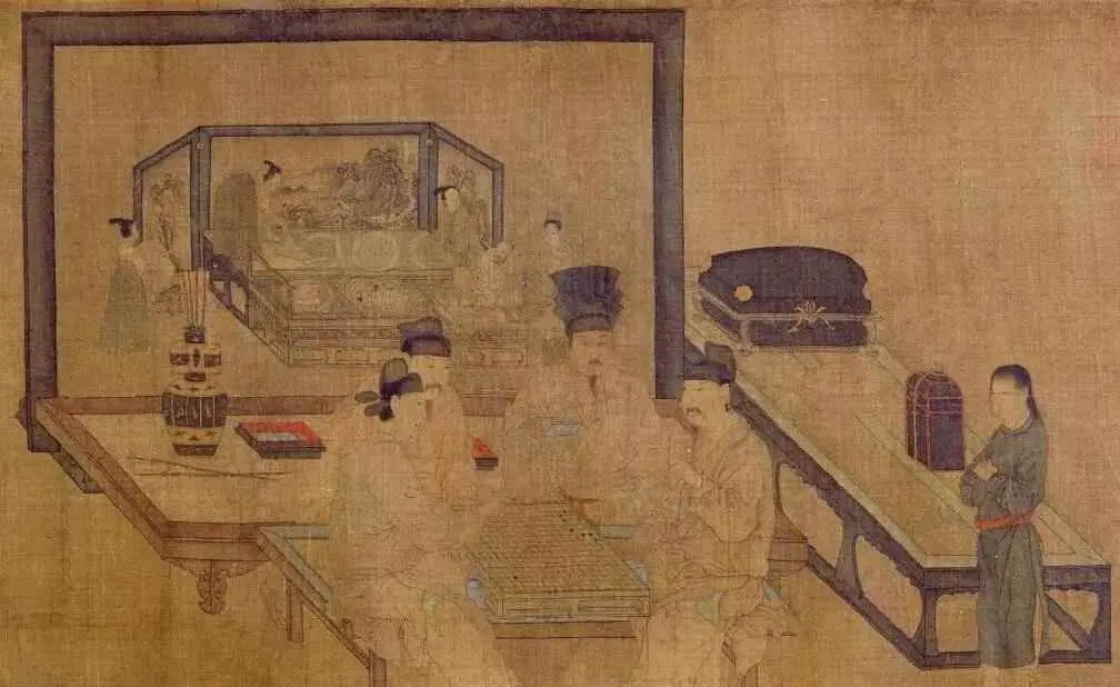 上图_《五代周文矩重屏会棋图》为南唐主李靖与弟弟景遂、景庚、景郭坐在沙发上下棋的场景。