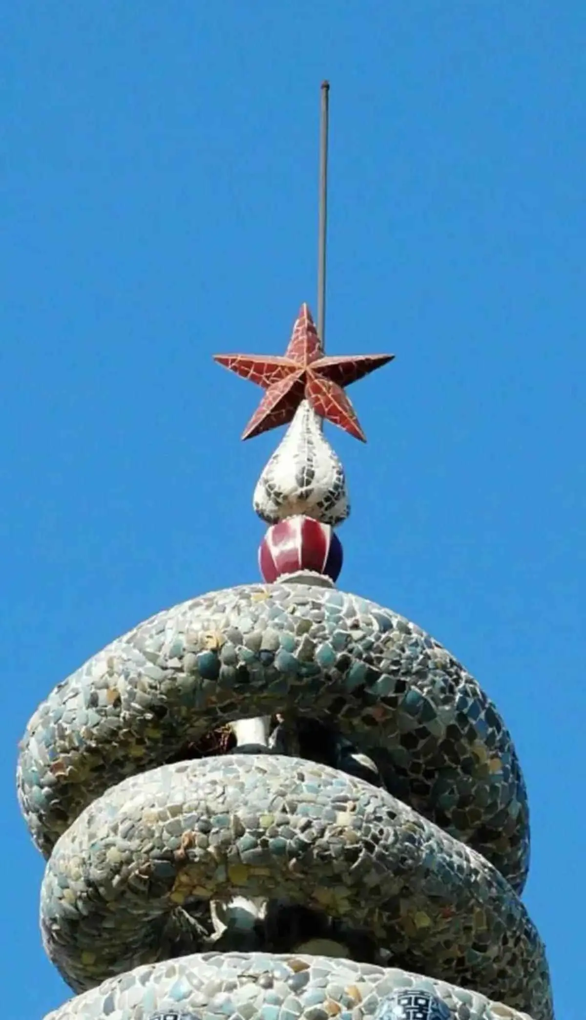 东南角上,用100多个大号古瓷瓶,一层层筑起一座九级“宝塔”,塔端是一只颜色鲜红带有窑变的八棱瓷罐,瓷罐上方又是一只由蓝白两色碎瓷镶成的“宝葫芦”,“葫芦”顶端支起一颗用祭红瓷古瓷碎片镶拼出来的五角星。