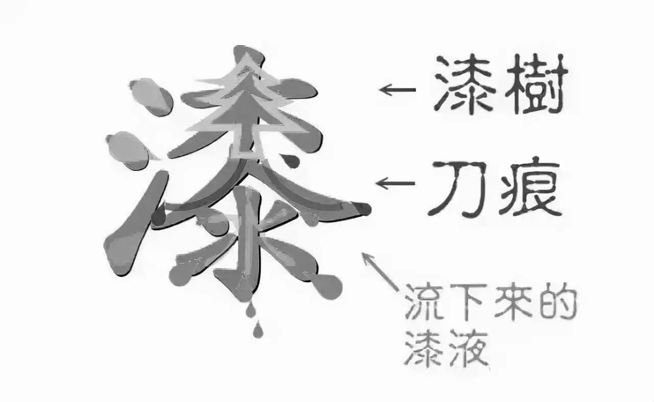 古字“桼”同“漆”,从象形文字中可理解为:“桼”字,上部从木,左右各一撇,像用刀切破树皮,以竹管外导,下部从水,像木汁流出状。