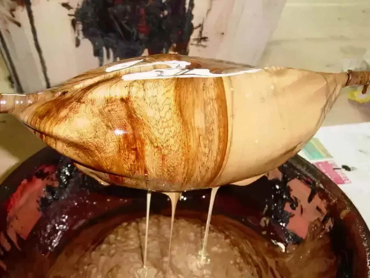 大漆师傅们将过滤后的生漆下盘晾晒,不断搅拌,让漆液和空气充分接触,并用红外线照射,取出水分,这样做的目的是为了增加附着力。