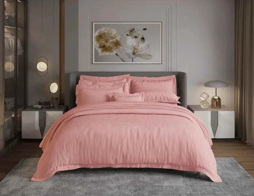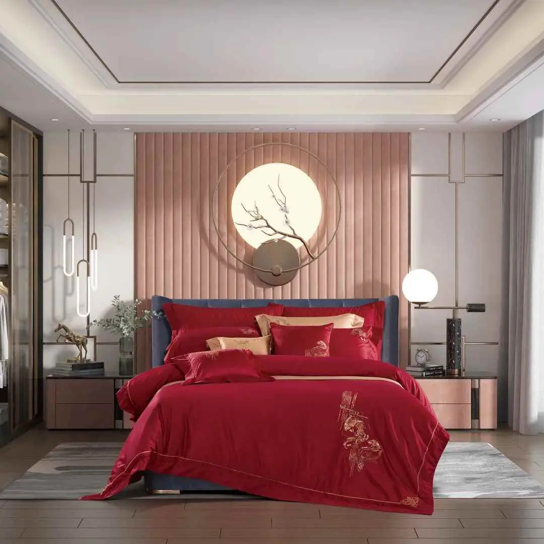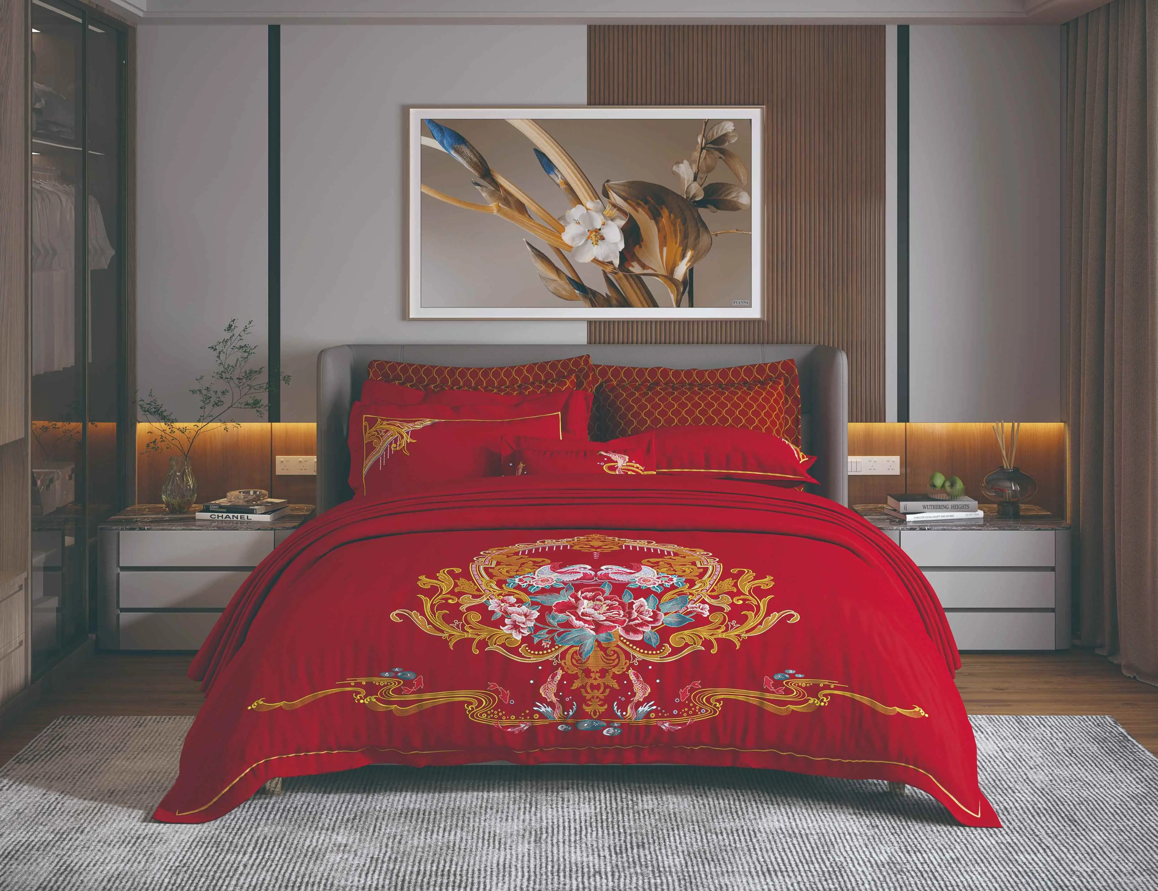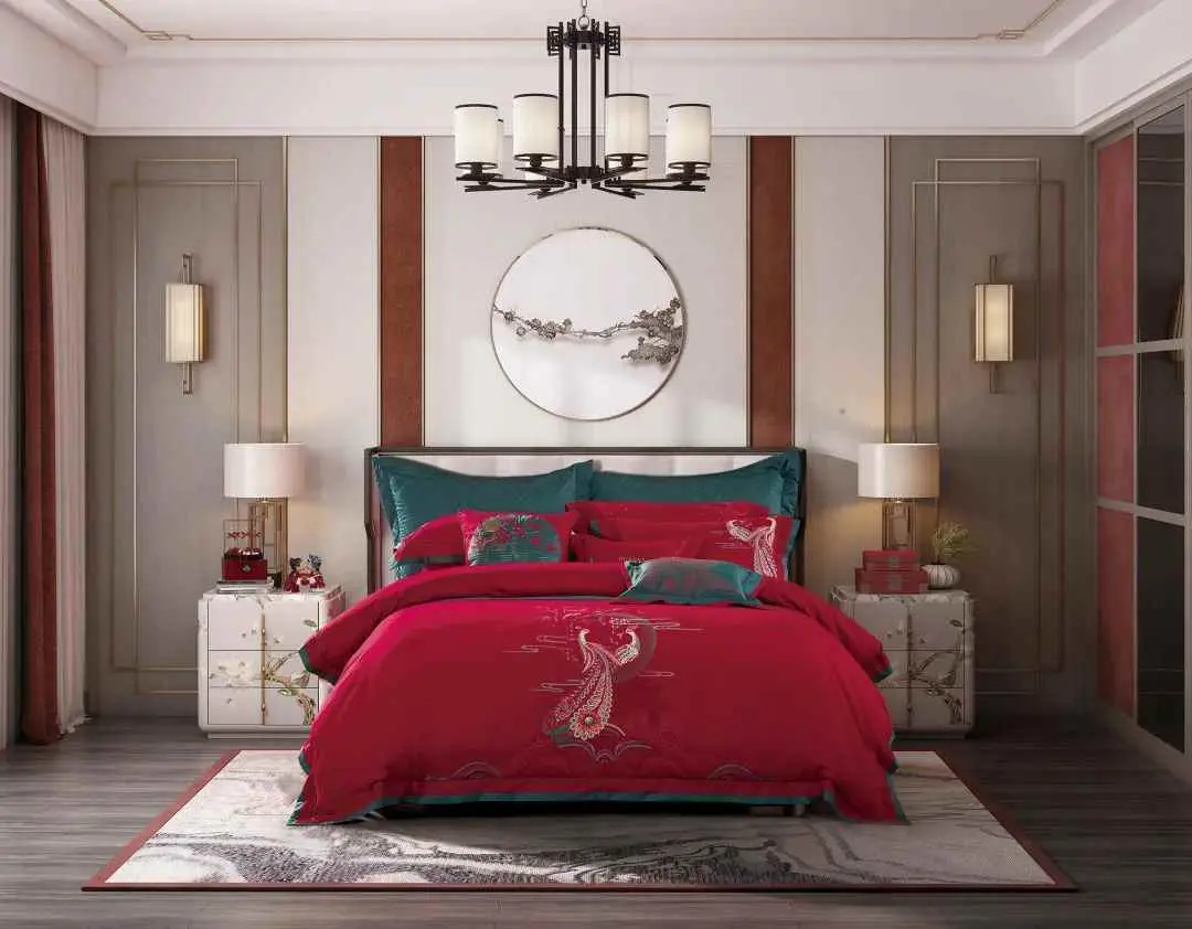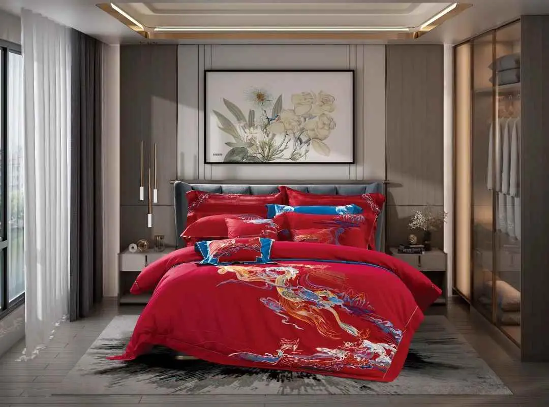 婚被的一般有好几种主流图案:寓意鸾凤和鸣的龙凤,花开富贵的牡丹,白头偕老的孔雀,好运连连的锦鲤,衣食无忧的钱币,子孙满堂的石榴花和此情绵长的中国结等。