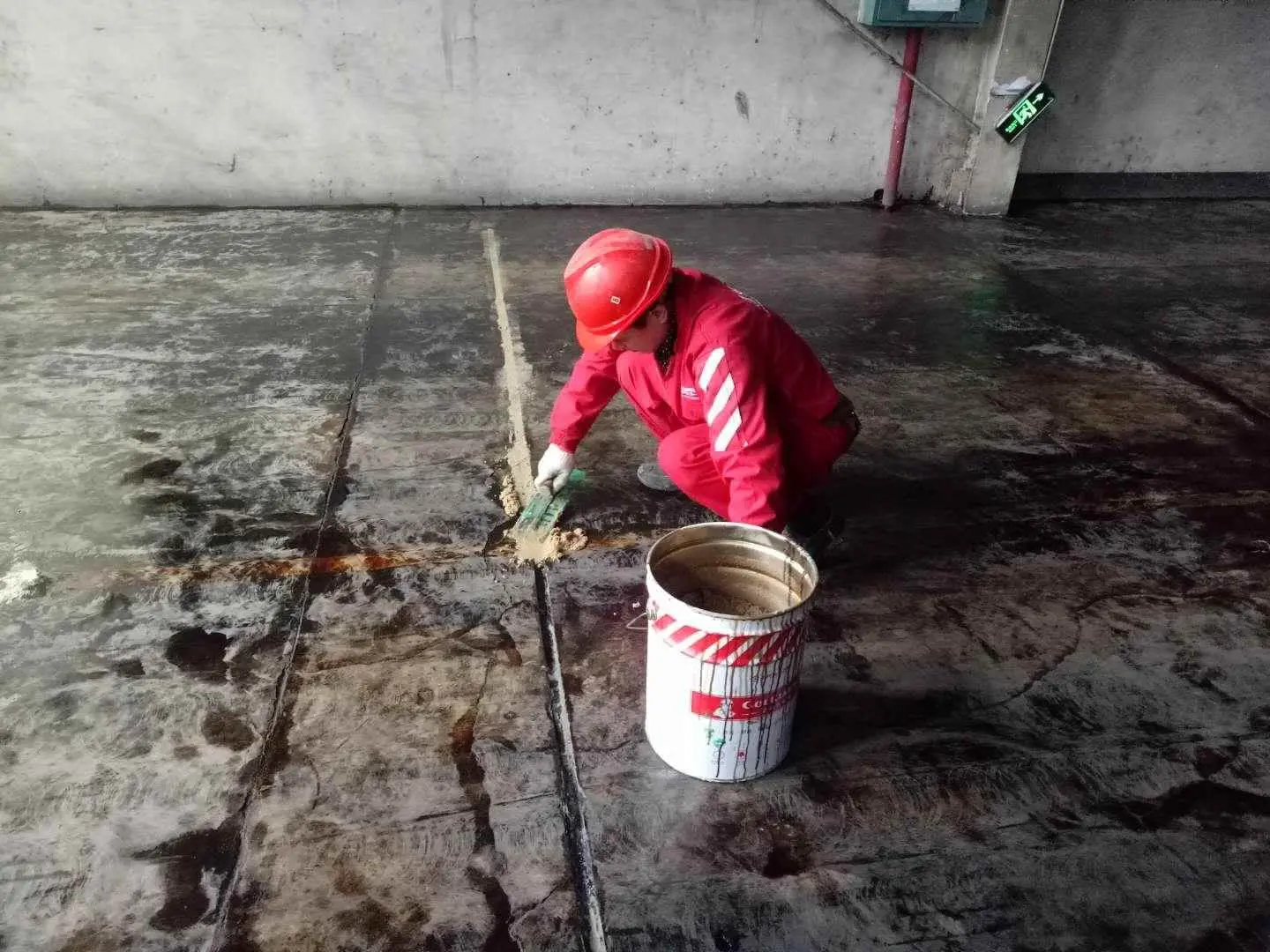① 凹凸不平的地面使用水性刚强砂浆进行填平修补,达到地面平整要求。
