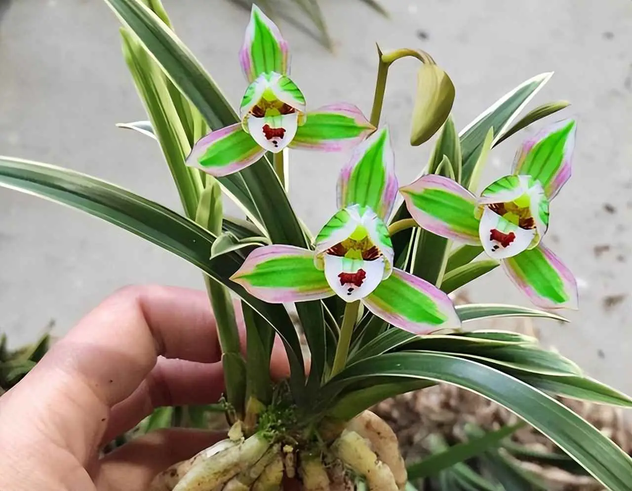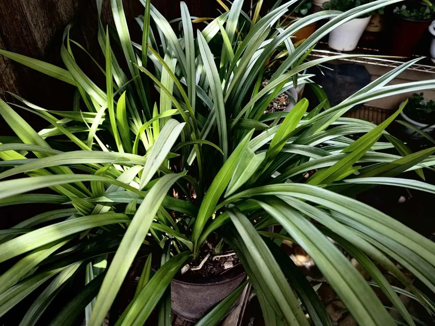 针对这种情况,最好还是给兰花重新换盆,先用吹风机的冷风模式把盆土全部吹干,之后倒扣一下,就可以将盆土分离,检查根系的健康情况,如果有发黑的部分,直接修剪掉,之后风干,重新配置土壤,用腐叶土加植金石,按照6:4的比例混合,后续浇水的时候,一定要浇透,烂根的几率就会大大降低;