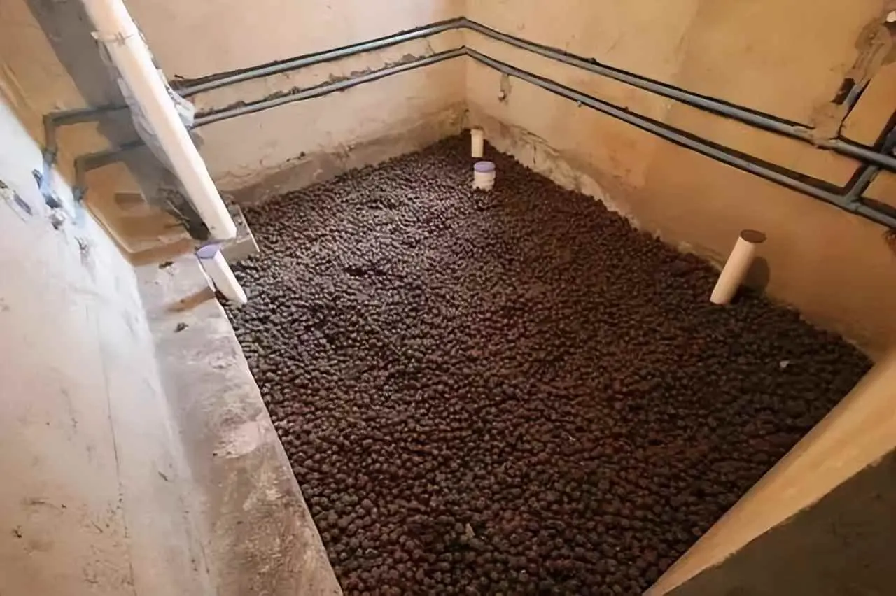 4、陶粒回填;陶粒材质轻,吸水性好,还具有防潮隔音的功效,是这几年比较主流的回填方式,很多质量过硬的装修队都会采用陶粒回填。