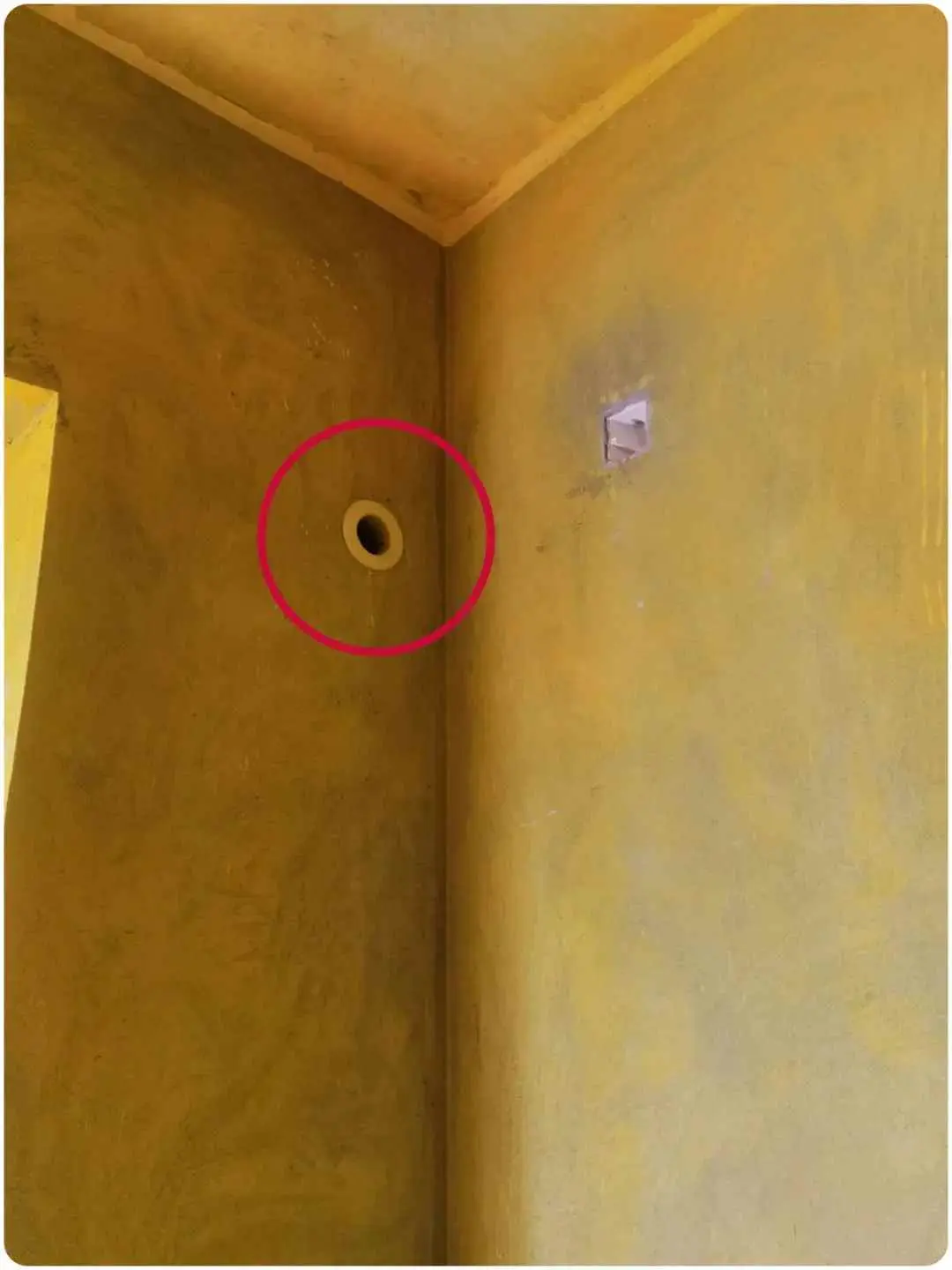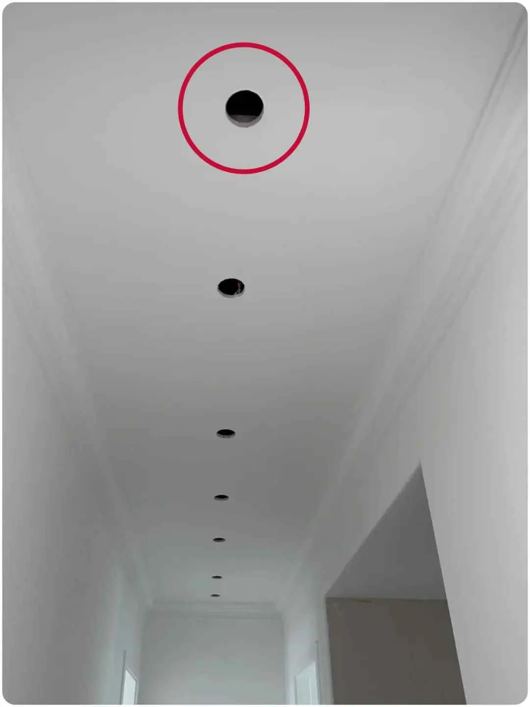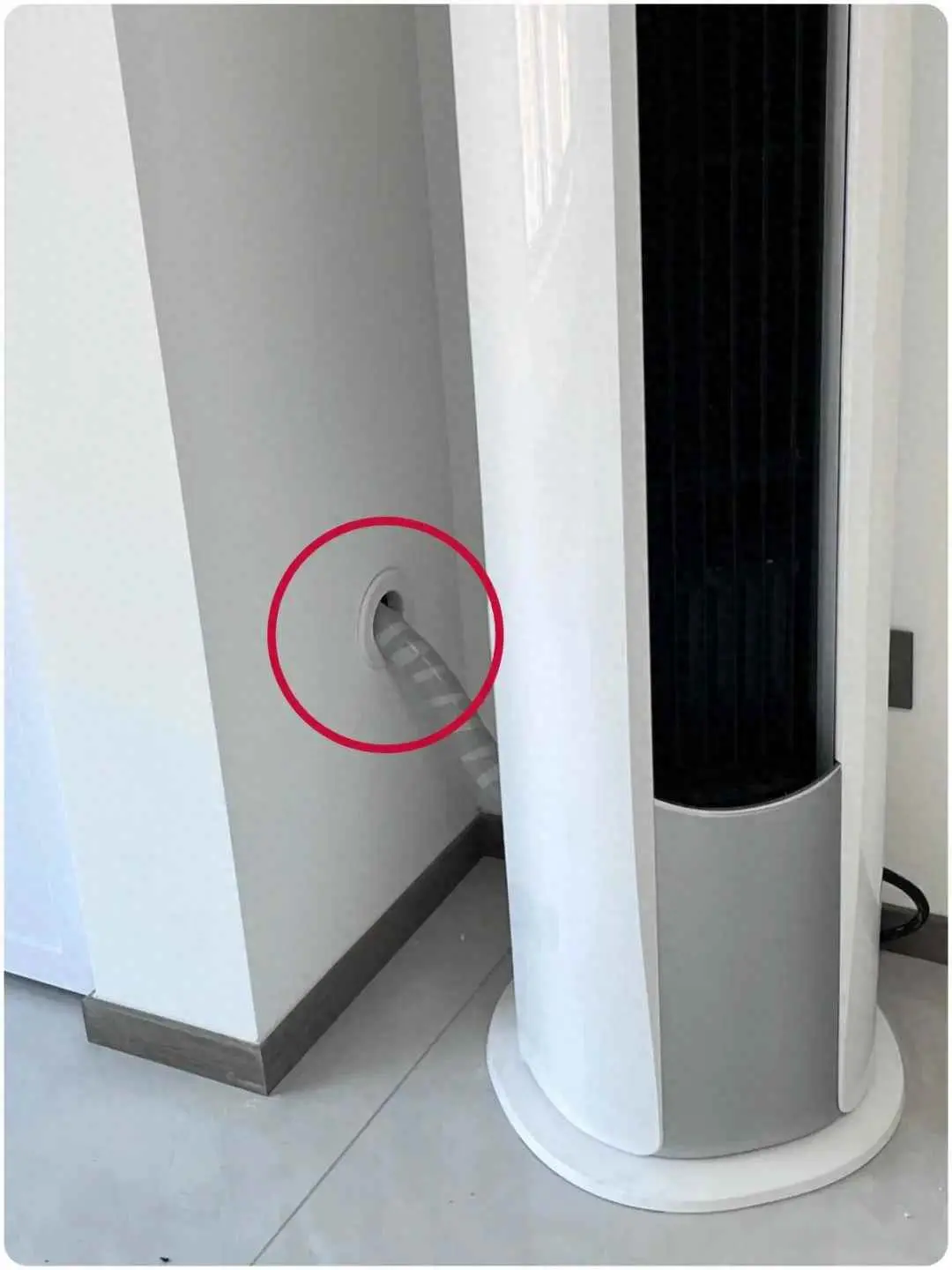 ▲卧室空调孔:开孔尺寸75mm,打孔位置需依据天花吊顶,确保上下均留有足够空间,以利于冷凝水顺畅排出。