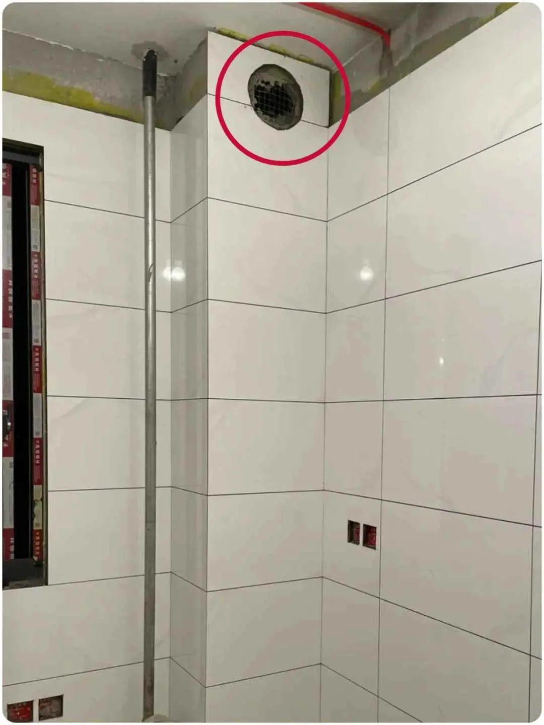 ▲卫生间排气孔,若需安装浴霸,还需预留110mm。打孔应在水电施工时进行,浴霸的孔位也应一致,应在吊顶上方,以避免后期管路暴露。