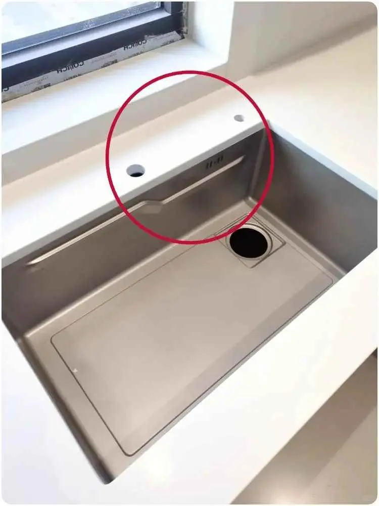 ▲厨房台面上的水龙头和净水器的孔洞,在加工石材台面时会一并处理,后期只需直接安装即可。