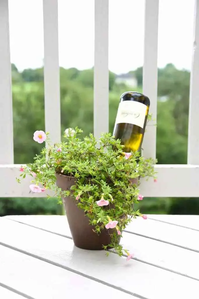 不确定应该浇多少水,不如直接用酒瓶帮你决定。将酒瓶装满水,瓶口向下插入土壤中,注意离植物根部稍远一点。当植物需要时,水会慢慢地释放出来,以后盆底再也不怕有积水。