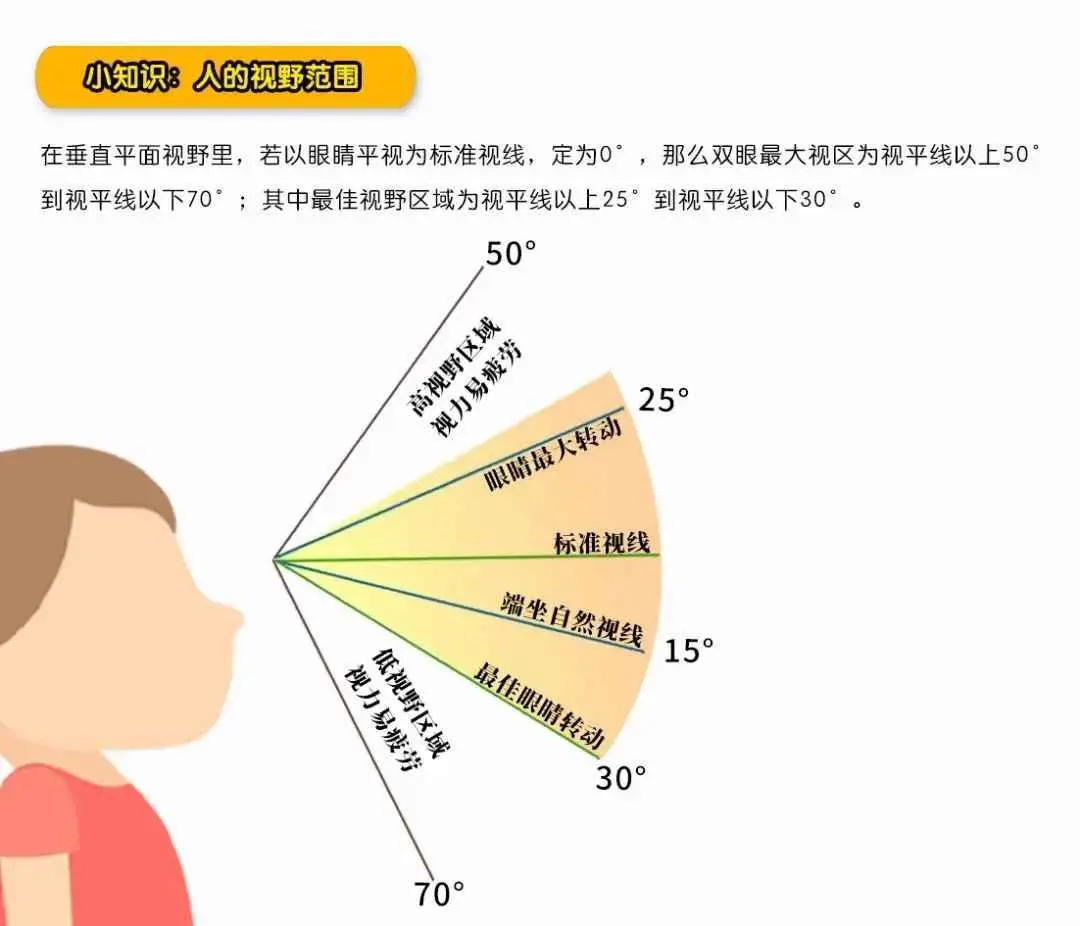 而一般来说,人眼看向物体最舒适的角度是平视,看前方的最佳视野角度约为70-85度。