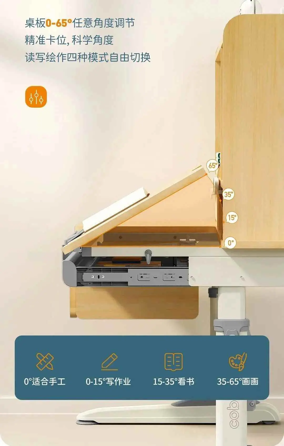 书桌作为陪伴孩子从小学到大学的学习生涯用品,当然要给孩子更健康舒适的学习环境。所以桌面倾斜调节设计,是出于对孩子视力、脊椎发育保护的深层考虑。