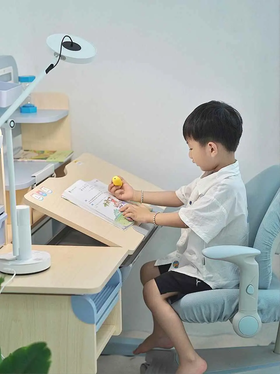 每个孩子的身高不同,具体的使用角度,可以根据实际情况微调。当桌面角度、座椅高度/坐深、桌子高度等调节到科学舒适状态时,孩子就能在这方小天地里舒适、自在、专注地进行学习娱乐活动,渐渐养成健康习惯。