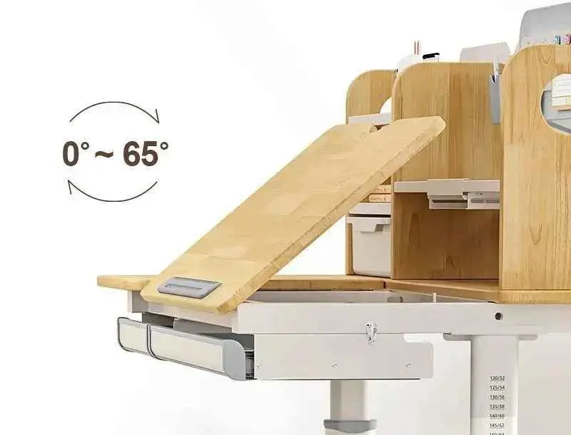 这款学习桌面倾斜,采用的是手动无极调节,省事不费力,孩子也能自己轻松调节。有0-50°、0-65°两种足够充裕的角度调节范围,满足孩子学习桌多种场景使用需求。