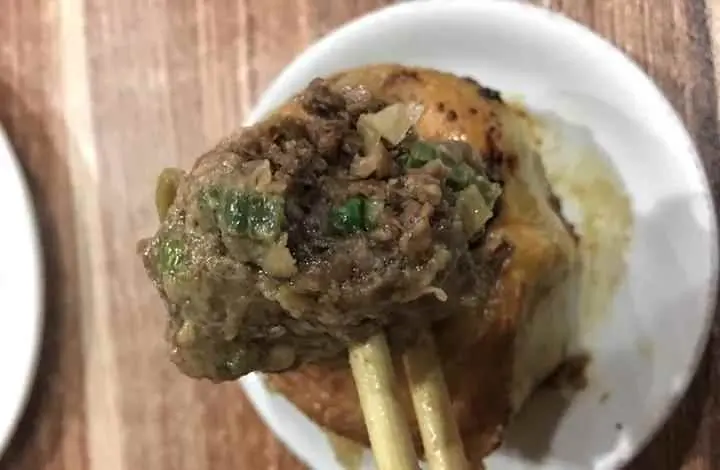 但第一次吃的朋友难免会被里面滚热滚热的馅儿烫得直咂吧舌头,所以吃门钉肉饼的正确方法是,先轻轻碰破一下软滑的周边,一口咬下去那牛肉汁就会顺着口子流出来(不这样吃很可能一口下去就是溅一身牛油)。而且一般吃的时候,最好淋上一些醋,既能去除油腻的感觉,又能带来更好的口感。