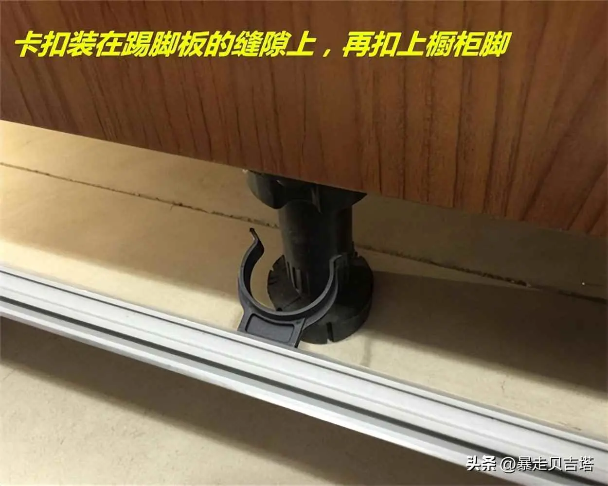 为了避免撑脚裸露在视线范围内,会需要使用橱柜踢脚线,通过卡扣设计,将踢脚线固定在橱柜垫脚上。