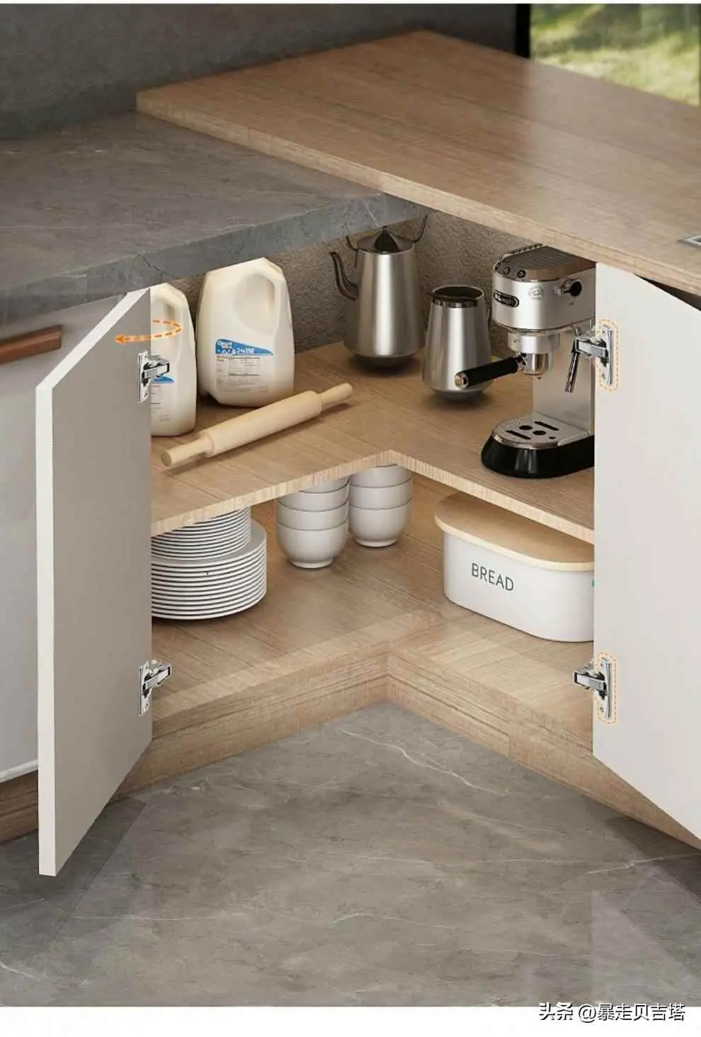 相对经济实惠的方案是将转角柜的柜门铰链换成165°的大角度铰链或者使用连体柜门,这两种方法都是通过加大开门面积,增加我们的操作空间来方便我们使用橱柜。当然,这并不是最合适的解决方案,只是平衡预算和功能性来说,性价比最高的一种解决方案。