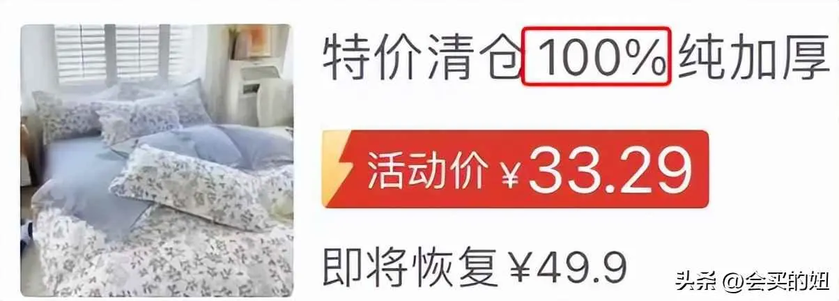 真相:这个“100%”很多时候只是一个商家的文字游戏而已!其实并非纯棉床品,如果你质疑或投诉时,商家可能会把它解释成“100%加厚”、“100%磨毛”等等,但绝对不会是“100%纯棉”。