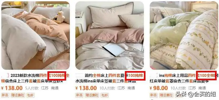 当你挑选四件套时一定会发现,很多商家在标题里会标注“100%纯棉”,相信很多小伙伴在购买床品时都会被这个看似高档的字眼所吸引。