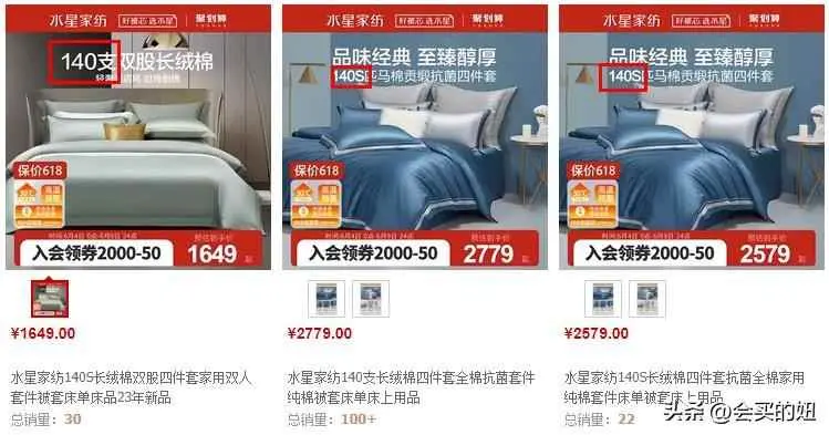 这个套路最常见一些直播间的商家,一来就是140支、160支、180 支的高级四件套才“298”、“388”这类的套路,然后忽悠大家买。