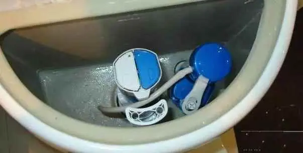 当我们方便后,按下冲水的按键,这时候就会扳动放水旋钮,水就会放出,放出一定程度后,水塞就会落下堵住出水口,停止出水,浮球也会随着水位的下降而下降。
