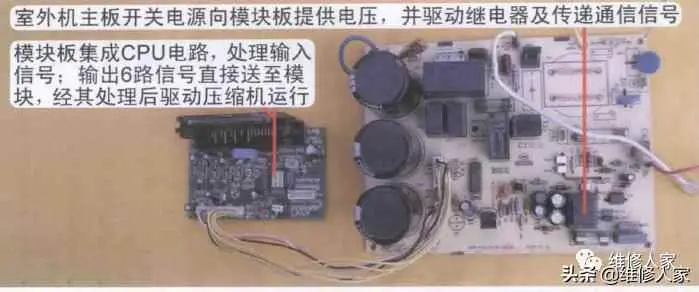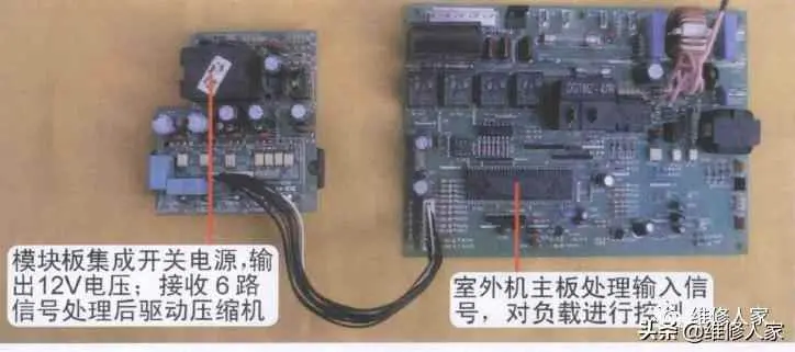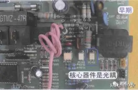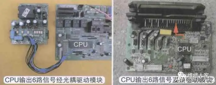 早期空调器主板CPU输出的6路信号不能直接驱动模块,需要使用光耦传递,因此模块与室外机CPU通常设计在两块电路板上,中间通过连接线连接。