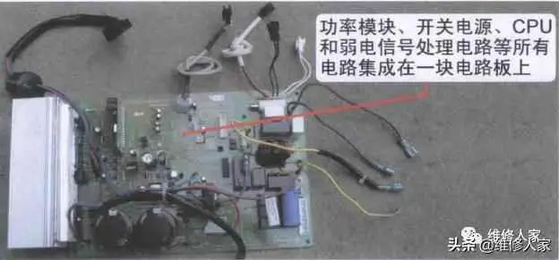 功率模块、硅桥、CPU和弱电信号处理电路、通信电路等所有电路均集成在一块电路板上,从而提高了可靠性和稳定性,出现故障时维修起来也最简单,只需更换一块电路板,基本上就可以排除室外机电控系统的故障。