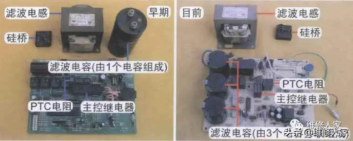 早期和目前的空调器电控系统均是由PTC电阻、主控继电器、硅桥、滤波电感和滤波电容5个主要元器件组成的;不同之处在于滤波电容的结构形式,早期电控系统通常由1个容量较大的电容组成,目前的电控系统通常由2 ~ 4个容量较小的电容并联组成。