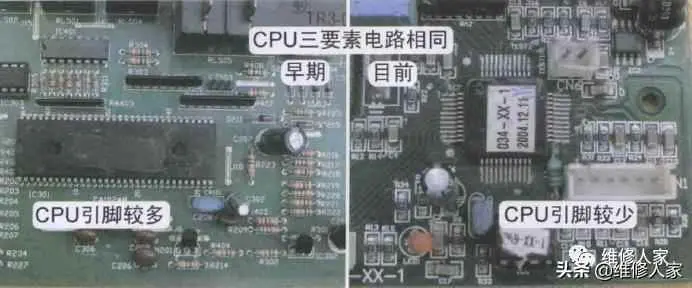 早期和目前的空调器主板CPU三要素电路原理均相同,只是早期的空调器主板CPU引脚 较多,目前的空调器主板CPU引脚较少。