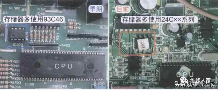 早期空调器主板的存储器多使用93C46,目前空调器主板的存储器多使用24CX x系列(24C01、24C02、24C04等)。