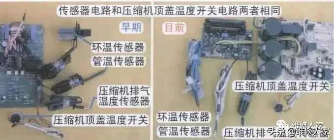 早期和目前的空调器主板中传感器电路和压缩机顶盖温度幵关电路相同。