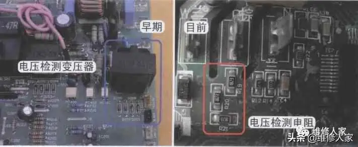 早期空调器的主板多使用电压检测变压器,向CPU提供随市电变化而变化的电压,CPU内部电路根据软件计算出相应的市电电压值。