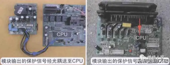 早期的空调器模块输出的保护信号经光耦耦合送至室外机主板CPU,目前的空调器模块 输出的保护信号直接送至室外机主板CPU。