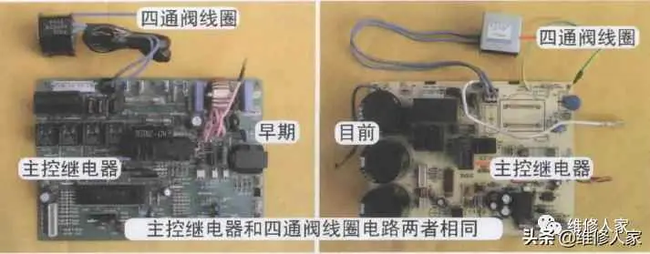 早期和目前空调器的主板中主控继电器电路和四通阀线圈电路相同。