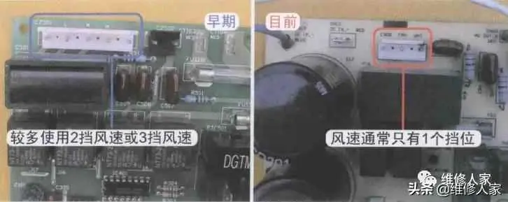 早期的空调器室外风机一般为2挡风速或3挡风速,因此室外机主板有2个或3个继电器; 目前的空调器室外风机风速一般只有1个挡位,因此室外机主板只设有1个继电器。
