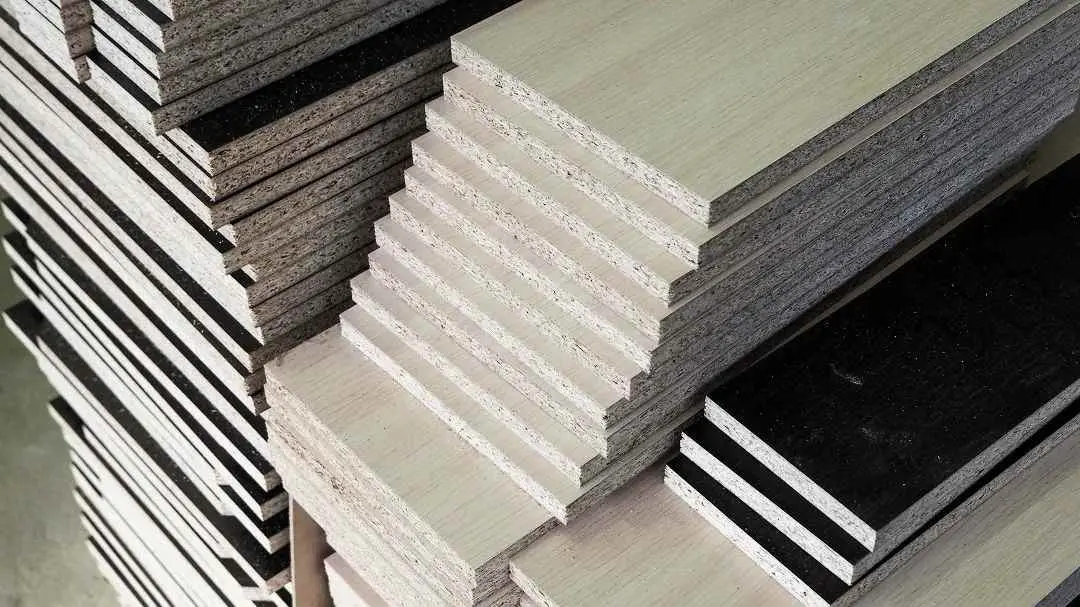 颗粒板,也称刨花板,这种板材是由木料碎屑和胶粘剂在热力、压力作用下压制而成的。