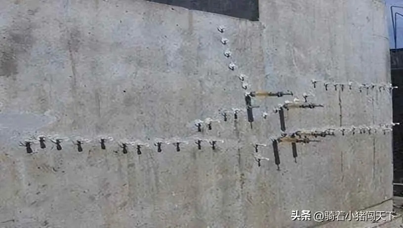 钻孔:采用风钻钻孔,孔距1-1.5m除浅孔采用骑缝孔外一般占孔轴线与裂缝呈30—45·斜角(见图3),孔深应穿过裂缝面0.5m以上,当钻孔有两排或两排以上时,宜交叉或呈梅花形布置。