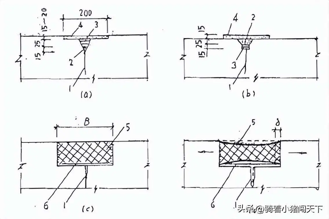 (d)活动裂缝扩展后的情况:1—裂缝; 2—水泥砂浆或环氧胶泥; 3—聚氧乙烯; 4—1:2.5水泥砂浆或刚性防水五层做法;5—密封材料;6—隔离缓冲区;B—槽宽;δ—裂缝活动距离