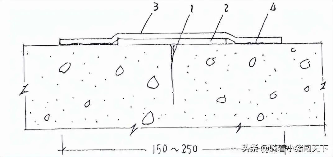 1—裂缝 2—油毡或塑料隔离层;3—聚丁橡胶密封条;4—粘结剂