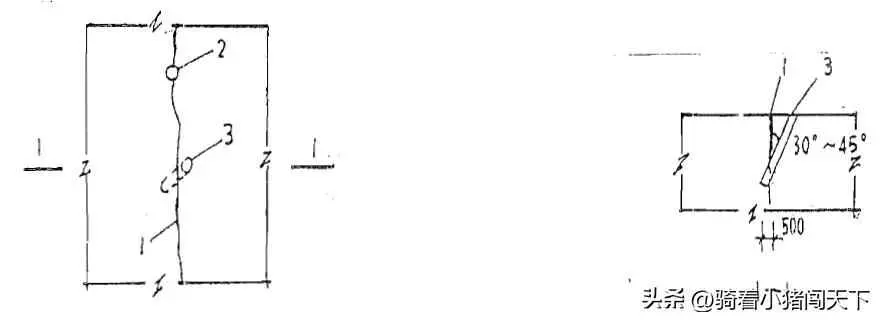 钻孔:采用风钻钻孔,孔距1-1.5m除浅孔采用骑缝孔外一般占孔轴线与裂缝呈30—45·斜角(见图3),孔深应穿过裂缝面0.5m以上,当钻孔有两排或两排以上时,宜交叉或呈梅花形布置;