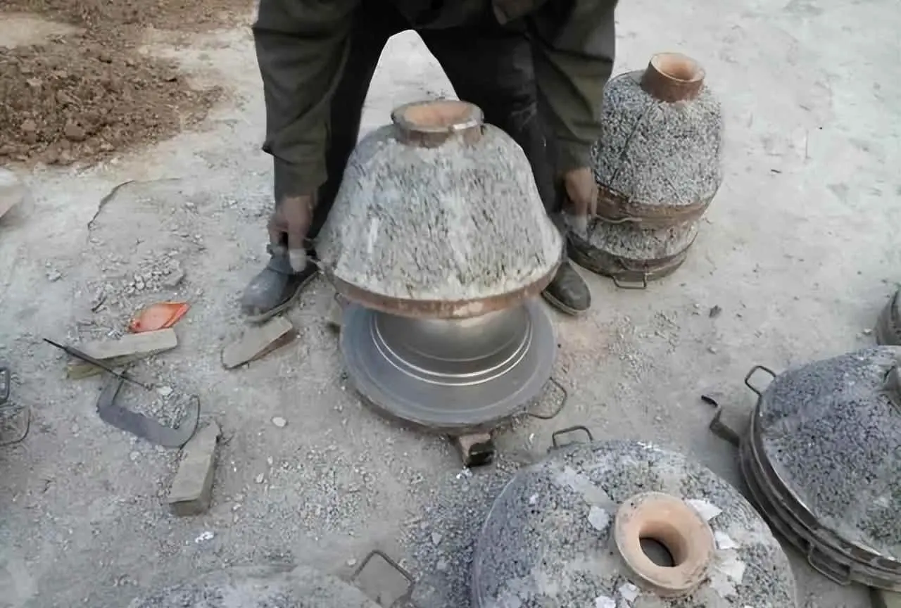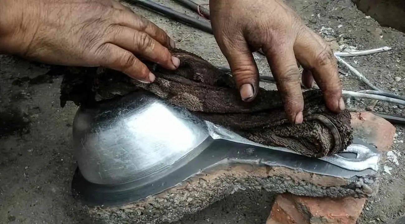 很快,已经成为"铝水"的材料就被倒入师傅带来的模具中,不一会儿,一个崭新的铝锅就这样诞生了,师傅们还会用工具将锅边的毛躁部分磨平,让它看起来更加完美无缺