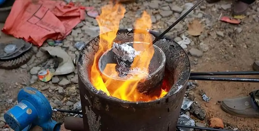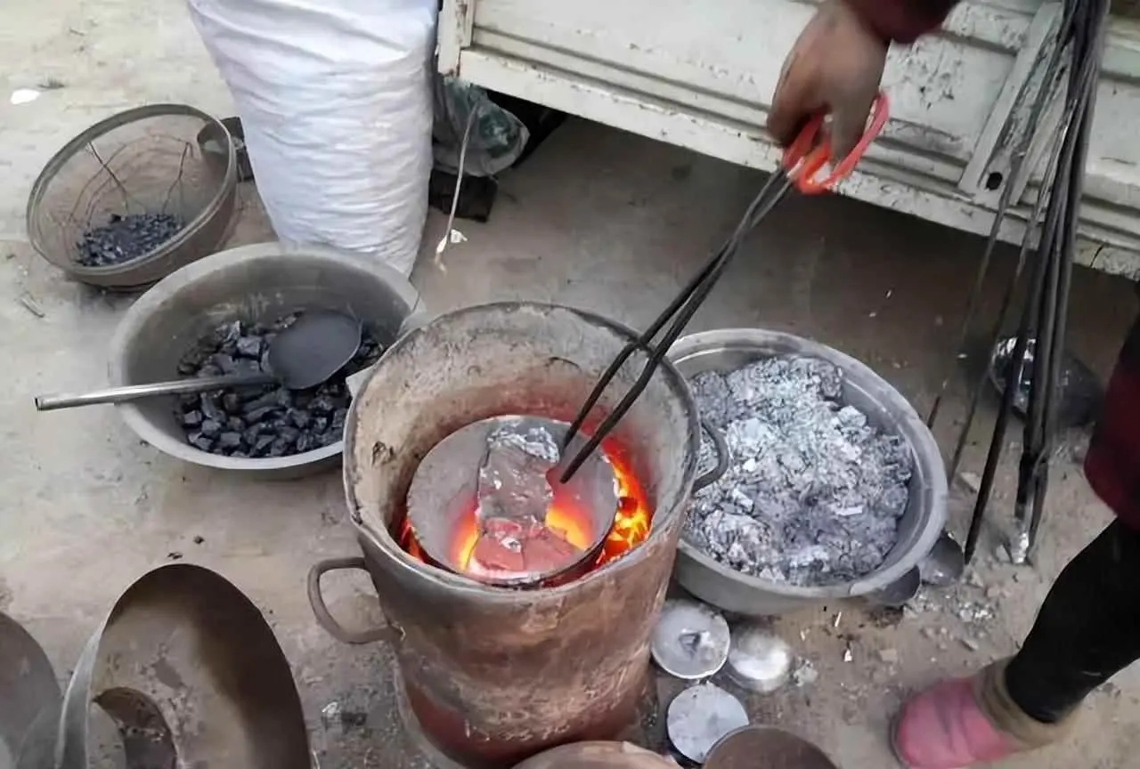 师傅们会仔细检查每一个人带来的易拉罐,看看是否符合要求,如果合格,就开始进行接下来的一系列操作,首先是将熔炉点燃,把易拉罐一个个放进去,随着火焰的燃烧,易拉罐逐渐化为"铝水",这也算是去除了一些表层的杂质,有时候,如果人们带来的易拉罐不够,师傅们还会额外加一些铝料,当然这需要额外付费
