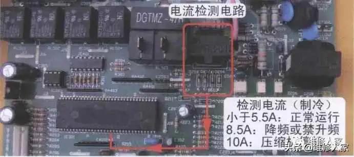 ② 停机保护条件:检测电流大于或等于制冷10A、制热11A,且维持10s,进入过电流保护状态,室外机CPU控制压缩机停机,并在室内机显示故障代码。