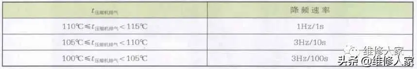 ③ 压缩机排气降频保护:压缩机排气温度大于等于100℃时,进入压缩机排气温度降频保护状态,CPU按照下表中的温度,控制不同的速率降频;排气温度降到小于100℃时,解除降频保护。