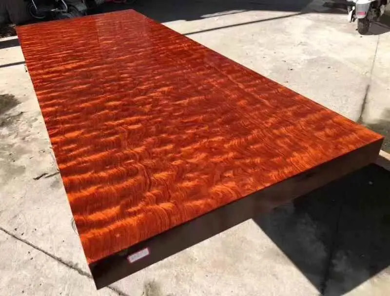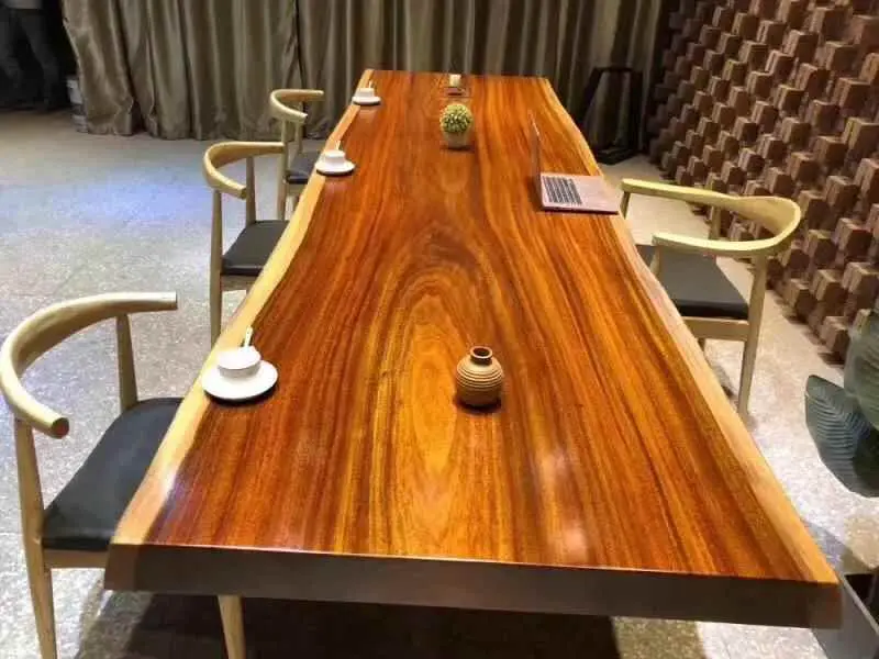 巴花大板是实木中最好的材质,巴花大板优点在于其木质特性不容易开裂、稳定性强,在北方干燥的情况下,开裂的几率也很低,且大口径的大板很多,颜色偏红色,给人感觉很沉稳大气。唯一的缺点就是贵!其价格是根据自身的纹路来决定的,纹理越密集,说明密度越高。价格从几千到几十万甚至上百万的都有,大家可以根据自己的实际情况来挑选。