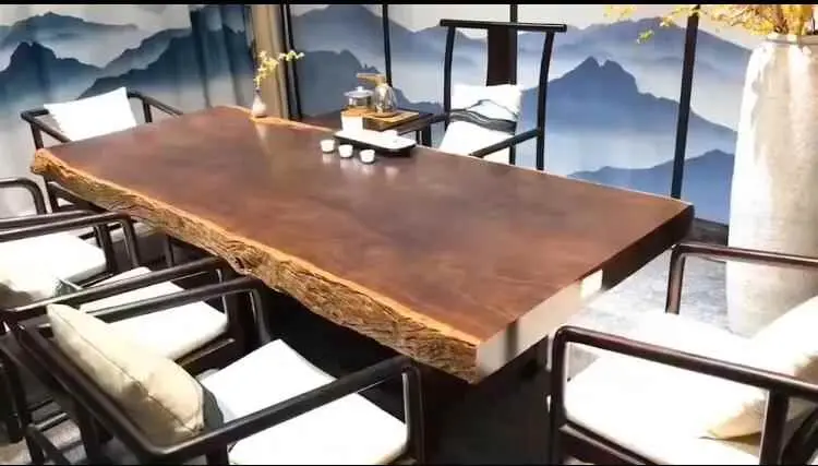 胡桃木大板也被称为南美花梨大板,胡桃木大板的优点在于轻薄、不变形不开裂,为什么这么说呢?因为胡桃木的厚度基本在5-7公分之间,且经过烘干,含水率可以达到实木家具的标准,尽管不经过烘干,胡桃木也是不容易开裂的,只是会容易发霉,所以要经过烘干。胡桃木自身的颜色纹理是都很现代化的,很受年轻朋友的喜欢。其价格也很有优势,在实木大板中也相对比较便宜,价格主要取决于其口径的大小。缺点在于,口径小,基本都是有一头很大,一头很小的自然边的实木大板